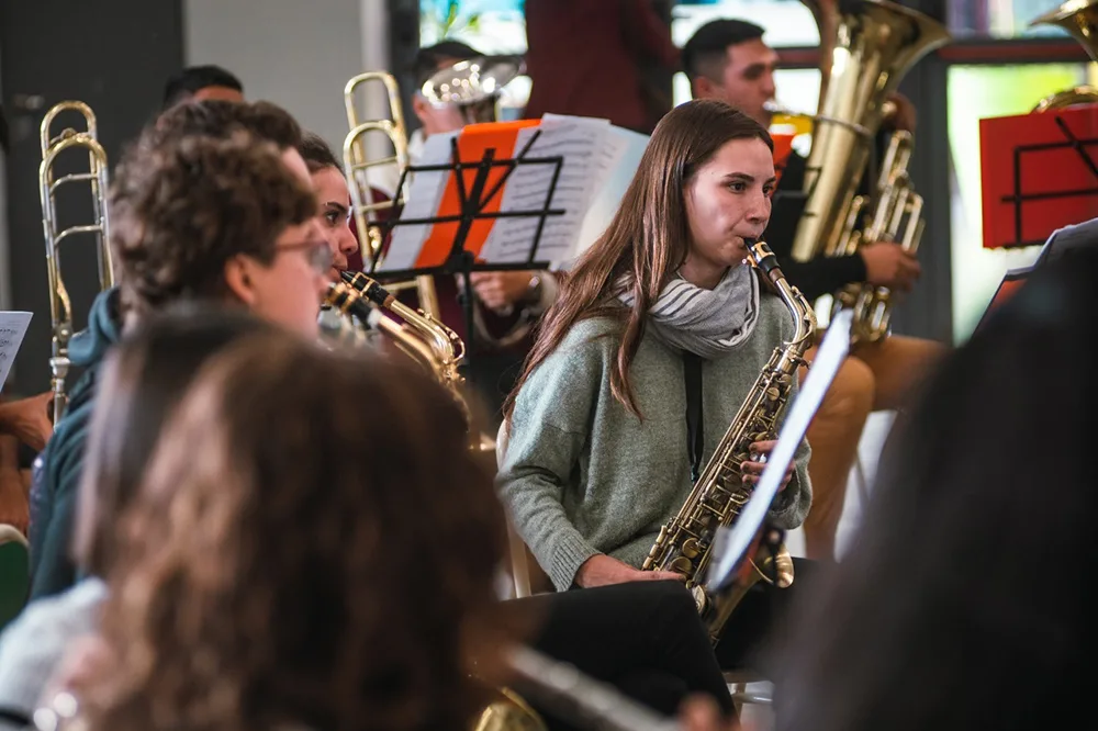 Con cupos limitados y se dicta enseñanza en los siguientes instrumentos: Clarinete y saxofón, flauta traversa, trompeta, corno, trombón, bombardino, tuba y percusión.