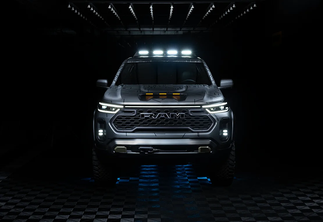 Entre los detalles, el Nightfall Concept destaca por su diseño imponente y su identidad RAM, reflejada en cada detalle. En el frente, una imponente parrilla con el nombre RAM calado domina la escena, enmarcada por una firma lumínica LED que recorre la parte superior y conecta con los faros también en tecnología LED.
