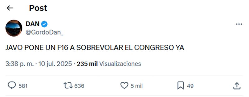 -Por último, El Trumpista (@ElTrumpista) expresó: “El Javo (Javier Milei) debería organizar milicias populares, entregando armamento a ciudadanos para facilitar el cierre del Congreso”.