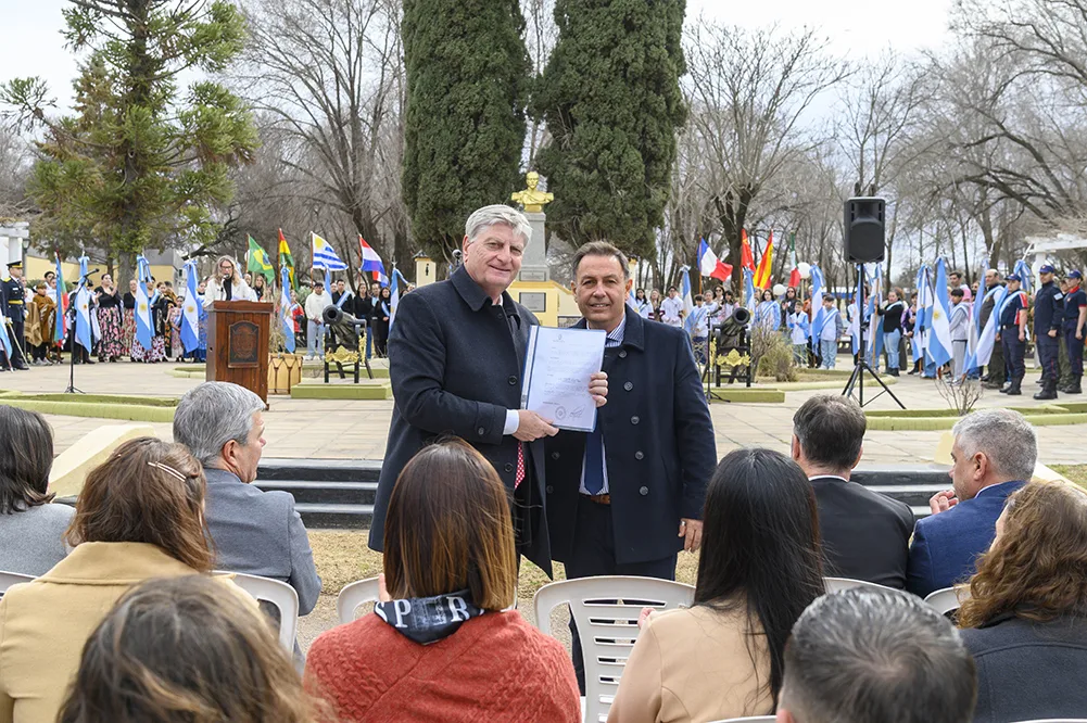 La actividad se desarrolló en el Parque Manuel J. Campos donde el Coro Municipal y Taller de Lenguaje de Señas interpretaron el Himno y el Gobernador y el Intendente dejaron una ofrenda floral al pié del busto del fundador de la localidad.