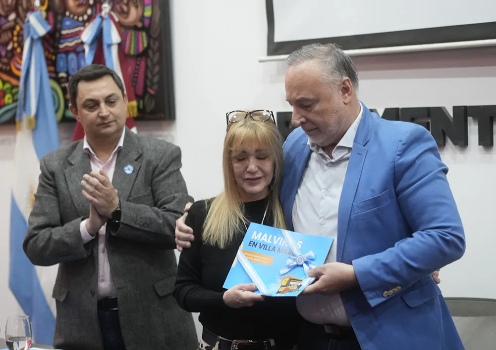 El primer ejemplar del libro “Malvinas en Villa María” fue presentado este jueves en el Parlamento de los Niños del Centro Cultural Comunitario “Leonardo Favio”. En la oportunidad, se entregaron ejemplares del libro a instituciones educativas, “cuyo objetivo es mantener la historia de nuestros héroes villamarienses y la causa Malvinas siga viva en cada generación”. La actividad estuvo encabezada por el intendente Eduardo Accastello; el secretario de Gobierno, Cultura y Relaciones Institucionales, Marcos Bovo; la directora de Museos y Patrimonio Histórico María de los Ángeles Basualdo; miembros del Centro de Veteranos de Guerra Islas Malvinas y familiares de los héroes villamarienses caídos en la Guerra de Malvinas, el cabo Roberto Adrián Busto y cabo Principal Norberto Delfín Güizzo.