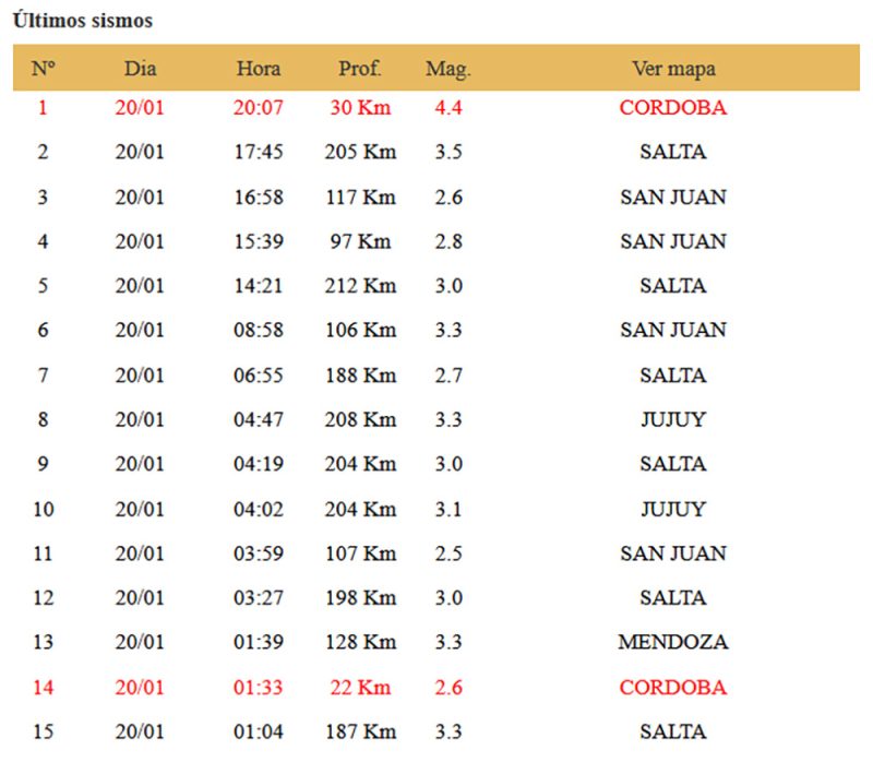 El Inpres informó que durante la jornada de este 20 de enero se produjeron un total de 15 sismos de distinta intensidad en Córdoba, Mendoza, San Juan, La Rioja, Salta y Jujuy. Hasta el momento, no se reportaron daños materiales ni personas afectadas por estos sismos.