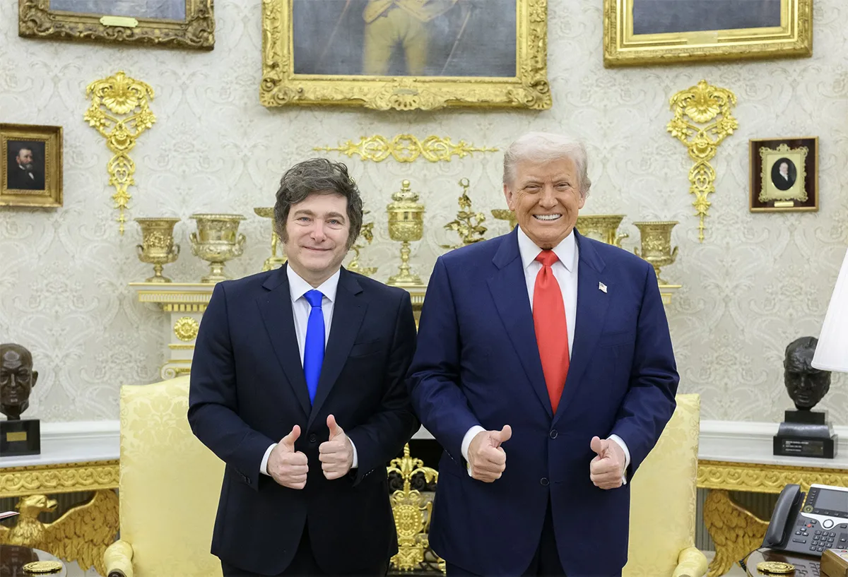 Milei arribó a la sede gubernamental en la ciudad de Washington DC las 14:39 hora de Argentina (una hora menos en los Estados Unidos) y fue recibido en la puerta por Trump, tras lo cual ambos saludaron sonrientes a las cámaras mientras levantaban el pulgar.